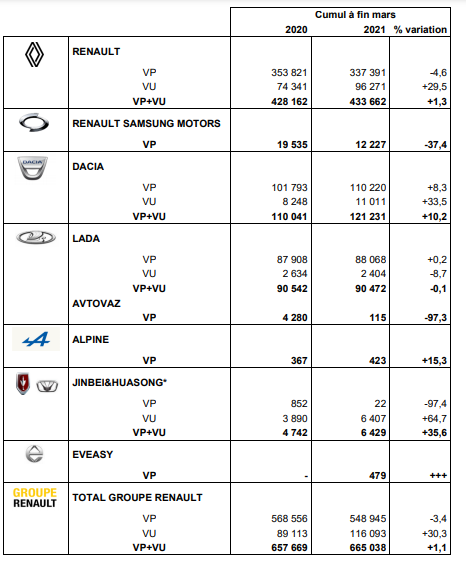 La marque Renault a vendu 433 662 véhicules au 1er trimestre 2021 soit une hausse de 1,3 % par rapport au 1er trimestre 2020.
